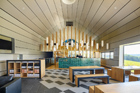 ploščicami v smaragdno zeleni barvi. Masivne mize in klopi